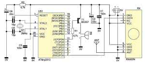 Schemat odbiornika zamieszczono na rysunku 2. Tak jak w nadajniku, tutaj również zastosowano mikrokontroler ATtimy2313 taktowany sygnałem o częstotliwości ustalonej za pomocą zewnętrznego rezonatora kwarcowego 2 MHz. Wciśnięcie przycisku w nadajniku jest sygnalizowane modulowanym piskiem buzzera sterowanego przez tranzystor T1. Jako odbiornik pracuje gotowy moduł RX433N, również pochodzący z oferty sklepu AVT. Obwód rezystor R2 – kondensator C6 powoduje opóźnia uruchomienie się mikrokontrolera po załączeniu napięcia zasilania. Kondensatory C1...C3 odfiltrowują potencjalne sygnały zakłócające. W stanie czuwania odbiornik pobiera prąd o natężeniu rzędu kilku miliamperów, podczas sygnalizacji prąd ten rośnie do 20 mA.