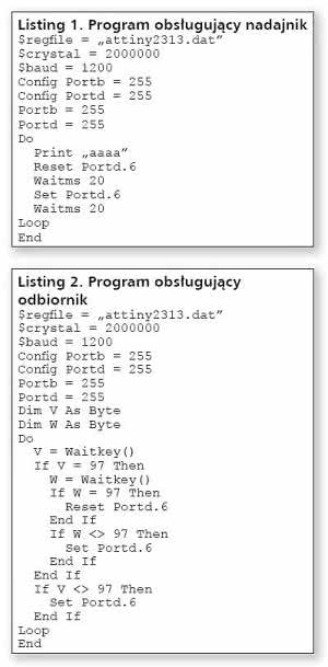 W dyrektywach kompilatora ustalona zostaje najmniejsza dostępna prędkość transmisji RS232, czyli 1200 bitów na sekundę, co jest zupełnie wystarczające w tej aplikacji a może zmniejszyć liczbę błędów transmisji. Wszystkie dostępne wyprowadzenia konfigurowane są jako wyjścia, a następnie zostaje na nich wyprowadzony poziom wysoki poprzez włączenie wewnętrznych rezystorów podciągających. W pętli nieskończonej mikrokontroler co 40 ms, wysyła do nadajnika nieskomplikowane hasło oraz miga diodą LED1, co jest potwierdzeniem prawidłowej pracy.