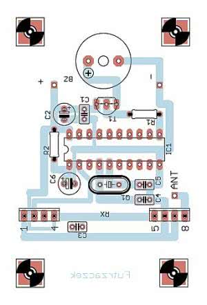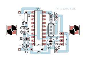 Schemat montażowy nadajnika pokazano na rysunku 3, natomiast odbiornika na rysunku 4. Oba urządzenia zmontowano na jednostronnych płytkach drukowanych. Montaż jest wykonywany typowo, od najmniejszych elementów do największych.