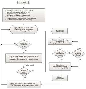 Po wykonaniu, odpowiednich czynności i przed wyjściem z procedury obsługi przerwania INT0 zostaje przywrócona domyślna konfiguracja portu PORTB i pinu INT0 w celu umożliwienia dalszej pracy urządzenia. Z resztą najlepszą ilustracją funkcjonalności układu pilota niech będzie kompletny algorytm programu obsługi przedstawiony na rysunku 2.