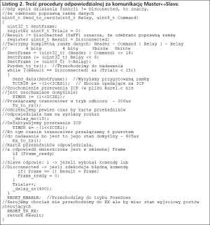 Przyjęto, iż przy braku odpowiedzi ze strony karty przekaźników lub w przypadku błędów transmisji, układ nadrzędny, czyli pilot sterujący ponawiał będzie wysyłanie rozkazu sterującego 15 razy. Na listingu 2 przed stawiono treść procedury odpowiedzialnej za utworzenie gotowej do przesłania ramki danych, jej przesłanie, odbiór odpowiedzi i kontrolę poprawności transmisji czyli procedury odpowiedzialnej za komunikację Master <-> Slave.