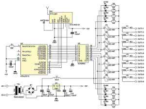 Przejdźmy, zatem do schematu urządzenia wykonawczego, jakim jest bezprzewodowy moduł przekaźników pokazany na rysunku 4. Tym razem do czynienia mamy z nieco bardziej rozbudowanym systemem mikroprocesorowym, choć stopień jego komplikacji wynika wyłącznie z niezbędnej liczby elementów potrzebnej do sterowania 8 przekaźnikami mocy.