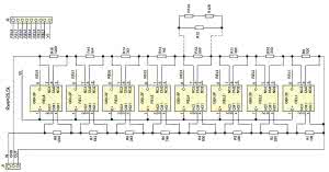 Schemat potencjometru regulatora głośności pokazano na rysunku 1. W prototypie ten potencjometr ma rezystancję 25,5 kΩ i bazowy krok 100 Ω. Pozostałe elementy są wielokrotnością i powstają poprzez odpowiednie połączenie rezystorów o opornościach: 100 Ω, 200 Ω, 200 Ω+200 Ω; 1,6 kΩ równolegle z 1,6 kΩ; 1,6 kΩ; 1,6 kΩ+1,6 kΩ; 6,2 kΩ+200 Ω, 12 kΩ szeregowo z połączonymi równolegle dwoma rezystorami 1,6 kΩ.