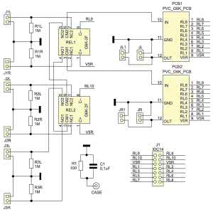 Obwód rezystor R1/ kondensator C1 ustala potencjał obudowy na poziomie masy jednocześnie w większości wypadków zapobiegając problemom z pętlą masy. W prototypie zrezygnowałem z regulacji balansu. Sterowanie przekaźników PVC kanału lewego i prawego jest połączone równolegle i doprowadzone jest do złącza J1.