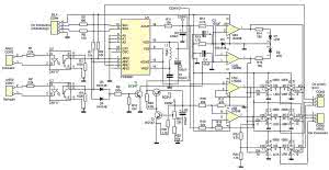CON4 to złącze interfejsu I²C podłączonego bezpośrednio komputera, do złącza CON8. Dławik L1 i kondensator C1 filtrują napięcie referencyjne. Obwód złożony z rezystora R11 i kondensatora C5 filtruje napięcie, ponieważ na wyjściu układu U1 ma ono kształt schodkowy. Napięcie to po odfiltrowaniu trafia do wzmacniaczy operacyjnych, U5 które dopasowują jego poziom do wymaganego przez sterownik silnika.