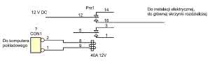 Do złącza CON3 doprowadzamy napięcie stałe 12 VDC, najlepiej ze złącza radia. Teraz należy odszukać przewód, w którym jest napięcie po przekręceniu kluczyka w pozycję włączonego zapłonu. W moim aucie był to gruby przewód o kolorze zielono-żółtym. Należy go przeciąć, a koniec prowadzący od stacyjki dołączyć do złącza CON4. Drugi koniec przewodu podłączamy do przekaźnika według schematu na rysunku 5. Masę do komputera dołączamy ze złącza radioodbiornika.