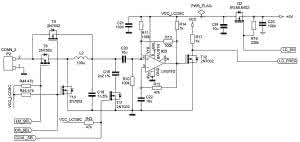 Diody D5 i D6 oraz kondensatory C30...C32 tworzą układ podwajania napięcia, zasilany sygnałem prostokątnym z wyjścia kanału PWM CH2N układu czasowo-licznikowego T1. Zadaniem tego układu jest dostarczenie podwojonego napięcia dla bramki tranzystora Q3 podczas startu przetwornicy, zapewniając tym samym poprawną pracę dla napięć niższych od 2,5 V.