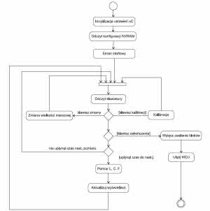 Obiekt klasy stepup_comverter implementuje funkcjonalność przetwornicy programowej, sterując tak wypełnieniem PWM, aby utrzymać stałe napięcie niezależnie od obciążenia przetwornicy. Obiekty freq_meter oraz lc_measure implementują, odpowiednio, funkcjonalność pomiarów częstotliwości oraz pojemności i indukcyjności. Działanie programu sterownika przedstawia diagram czynności na rysunku 5.