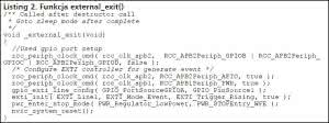 Wykrywanie stanu bezczynności odbywa się poprzez stwierdzenie braku zmian mierzonej wielkości w zadanym czasie. Procedury startowe crt0 systemu ISIX RTOS zawierają dodatkową funkcję _external_exit(), która jest wywoływana jako ostatnia czynność już po wykonaniu kodu destruktorów (listing 2). Jej zadaniem jest przygotowanie mikrokontrolera do bezpiecznego przejścia do trybu obniżonego poboru mocy oraz do ponownego wybudzenie, po wciśnięciu klawisza ON/UP.