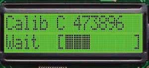 W górnej linijce wyświetlana jest informacja o przebiegającej kalibracji oraz częstotliwość pracy generatora LC, w dolnej linii wyświetlany jest aktualny pasek postępu. Należy skontrolować aktualną częstotliwość F1 generatora, która na początku procesu powinna wynosić 400...500 kHz, natomiast gdy pasek postępu przekroczy 50%, częstotliwość F2 generatora powinna wynosić około 220...270 kHz.