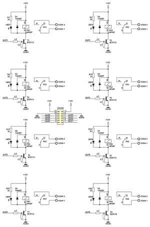 Jak wspomniano, blok wykonawczy zamontowano na oddzielnej płytce drukowanej. Znajdują się na niej tranzystory cyfrowe BCR112 (T1...T8), które sterują przekaźnikami PK1...PK8. Diody LED1...LED8 sygnalizują pracę poszczególnych przekaźników. Złącze CONN9 przenosi sygnały do sterowania przekaźnikami oraz napięcie zasilania 12 V.