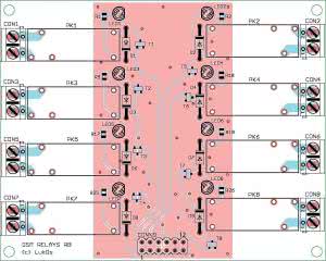 Montaż płytki przekaźników zaczynamy od przylutowania elementów SMD: rezystorów R1, R2, R9, R10, R17, R18, R25, R26 oraz tranzystorów T1...T8. Kolejnym etapem jest montaż diod D1...D4, D6...D9 oraz diod LED1...LED8. Na koniec montujemy przekaźniki PK1...PK8 i złącza CON1... CON8. Przy montażu CONN9 (typ konektora żeński) należy pamiętać, że płytka przekaźników znajduje się nad płytką sterowania, więc CONN9 będzie zamontowany od strony warstwy lutowania.