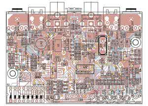 Schemat montażowy karty pokazano na rysunku 3. Montaż elementów najlepiej rozpocząć od wlutowania układu U2 typu PCM2902C. Układ ten ma obudowę SSOP28 o rozstawie nóżek 0,65 mm. Po jego wlutowaniu należy sprawdzić czy nie ma zwarć miedzy wyprowadzeniami. W miejsce układu U2 można ewentualnie wlutować układ typu PCM2906C. Oba układy mają identycznie rozmieszczone wyprowadzenia i takie same bloki funkcjonalne.