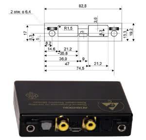 Płytkę drukowaną umieściłem w plastikowej obudowie (po elementach elektronicznych) o wymiarach 82,8 mm×56,5 mm×19,2 mm. Rozmieszczenie złącz pokazano na rysunku 4, natomiast szkice otworów do wykonania w obudowie na rysunku 5 i rysunku 6.