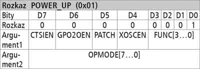Rozkaz POWER_UP musi być pierwszym rozkazem, jaki zostanie wysłany do układu nadajnika po ustawieniu sygnału zerowania (RST=1), gdyż umożliwia aktywację peryferiów układu Si4713 oraz konfigurację podstawowych parametrów jego pracy. Znaczenie poszczególnych bitów w kolejnych argumentach przedstawia się następująco: