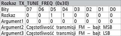 Rozkaz TX_TUNE_FREQ pozwala na przestrojenie nadajnika FM układu Si4713. 16-bitowe słowo określone argumentami Argument2/Argument3 wyznacza nową częstotliwość transmisji, przy czym dla przykładu: wartość 7610 odpowiada częstotliwości 76,10 MHz zaś wartość 10800, częstotliwości 108,00 MHz itd. Wysłaniu tegoż rozkazu sterującego powinno towarzyszyć następujące bezpośrednio po nim sekwencyjne odczytywanie rejestru statusu układu Si4713 (za pomocą rozkazu sterującego GET_INT_STATUS) w oczekiwaniu na ustawienie bitu STCINT sygnalizującego zakończenie operacji przestrajania (jeśli nie uruchomiono dedykowanego przerwania STC).