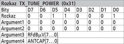 Rozkaz TX_TUNE_POWER pozwala na określenie mocy transmisji nadajnika FM układu Si4713 oraz pojemności kondensatora w obwodzie strojenia anteny. Wysłaniu tegoż rozkazu sterującego powinno towarzyszyć następujące bezpośrednio po nim sekwencyjne odczytywanie rejestru statusu układu Si4713 (za pomocą rozkazu sterującego GET_INT_STATUS) w oczekiwaniu na ustawienie bitu STCINT sygnalizującego zakończenie operacji zmiany mocy sygnału (jeśli nie uruchomiono dedykowanego przerwania STC). Znacznie poszczególnych argumentów jest następujące: