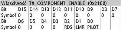 Właściwość TX_COMPONENT_ENABLE pozwala określić, które z komponentów sygnału FM znajdą się w widmie transmitowanego sygnału radiowego. Znaczenie poszczególnych bitów jest następujące: