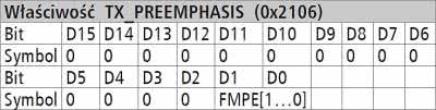 Właściwość TX_PREEMPHASIS pozwala określić wartość tzw. preemfazy sygnału FM według następującej specyfikacji: FMPE[1...0]=0x00 → 75 ms (Stany Zjednoczone), FMPE[1...0]=0x01 → 50 mms (Europa, Australia, Japonia), pozostałe wartości → Zarezerwowane.