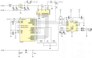 Ponadto, urządzenie wyposażono w stabilizator liniowy 78M05 zapewniający napięcie zasilania dla wyświetlacza LCD (+5 V) oraz, poprzez dwie diody 1N4148, napięcie zasilające mikrokontroler i układ Si4713 (ok. 3,4 V). Jest to najprostsze i jednocześnie dopuszczalne rozwiązanie w przypadku, gdy system mikroprocesorowy jest zasilany napięciem 3,3 V a wyświetlacz napięciem 5 V. Wyłącznie w takim przypadku, gdy nie korzysta się z operacji odczytu danych z wyświetlacza (wyprowadzenie R/W podłączone na stałe do masy).
