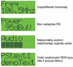 Każdorazowe opuszczenie trybu edycji, inicjowane ponownym przyciśnięciem przycisku MODE, powoduje po pierwsze, wysłanie bieżących ustawień do układu Si4713, natomiast po drugie, zapisanie ich w nieulotnej pamięci EEPROM mikrokontrolera, by ustawienia te stały się aktywne po ponownym włączeniu zasilania. Wygląd wszystkich, dostępnych pozycji menu pokazano na rysunku 4.