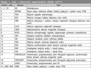 Wymienione parametry układu predysponują go do zastosowania również w konstrukcjach amatorskich zwłaszcza, że aplikacja układu ogranicza się do zaledwie kilku elementów zewnętrznych. Wynika to z faktu, że w budowie układu Si4711/4713 zastosowano zaawansowany, cyfrowy tor przetwarzania sygnału. Na rysunku 1 pokazano wygląd obudowy układu Si4713, natomiast w tabeli 1 zamieszczono opis i znaczenie poszczególnych wyprowadzeń.