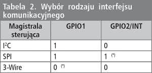 Rodzaj interfejsu komunikacyjnego wybiera się poprzez ustawienie odpowiednich stanów logicznych na wyprowadzeniach GPIO1 oraz GPIO2/INT. Logika sterująca zapamiętuje go podczas rosnącego zbocza sygnału na wejściu zerowania układu RST. Możliwe ustawienia umieszczono w tabeli 2.