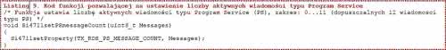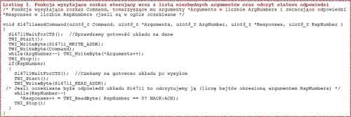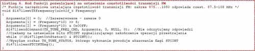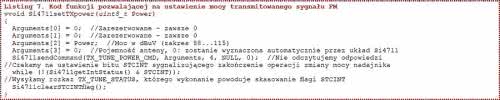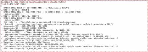 Na listingach pokazano funkcje odpowiedzialne za realizację wspomnianych funkcjonalności tj. wysłania rozkazu sterującego wraz z listą niezbędnych argumentów (listing 1) i odczyt statusu odpowiedzi oraz funkcji odpowiedzialnej za zmianę właściwości funkcjonalnych układu Si4713 (listing 2). W ciele funkcji Si4713send- Command użyto funkcji narzędziowej Si4713WaitForCTS, której zadaniem jest sprawdzenie gotowości układu Si4713 na przyjęcie danych (dokładnie, sprawdzenie bitu CTS w rejestrze statusu układu). Funkcję Si4713WaitForCTS pokazano na listingu 3. Funkcję inicjalizującą układ pokazano na listingu 4. Do analizy kodu funkcji inicjalizacyjnej jest niezbędna znajomość zawartości pliku nagłówkowego, który za każdym razem tworzę w taki sposób, aby bez konieczności zaglądania do dokumentacji układu, móc zorientować się w możliwościach peryferium, którego ten kod dotyczy. Zawartość wspomnianego pliku nagłówkowego pokazano na listingu 5.