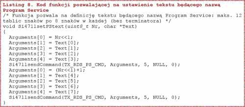 Na koniec przedstawię kod kilku krótkich funkcji narzędziowych pozwalających na ustawienie częstotliwości i mocy transmitowanego sygnału FM oraz dającą możliwość zdefiniowania własnych wiadomości systemu RDS (typu Program Service). Kody dwóch pierwszych funkcji pokazano na listingach 6 i 7. Na listingach 8 i 9 pokazano kod dwóch krótkich funkcji pozwalających na ustawienie wiadomości typu RDS Program Service (nazwa stacji), którą układ Si4713 będzie transmitował razem z wysyłanym dźwiękiem. Przy okazji należy wspomnieć, iż tego typu konfiguracja układu Si4713 w zakresie systemu RDS jest rozwiązaniem najprostszym i najszybszym, jednak sam układ udostępnia ogromną listę możliwości, jeśli chodzi o transmisję wiadomości tego typu.