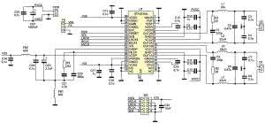 Schemat modułu końcówki mocy z wejściem I²S pokazano na rysunku 1. Moduł jest zbudowany w oparciu o specjalizowany układ scalony STA333ML (U1) firmy STMicroelectronics. W strukturze zawiera on dwa wzmacniacze mocy pracujące w klasie D, sterowane 24-bitowym modulatorem, interfejs I²S oraz układy zabezpieczeń. Do poprawnej pracy wymaga dwóch napięć zasilających: 4,5...20 V dla części mocy (doprowadzenia VCC1, VCC2) i 3,3 V dla części sygnałowej (VDD).