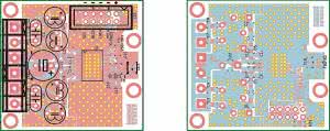 Ze względu na znaczne prądy i sygnały w.cz. o różnych poziomach mocy, krytyczne jest zaprojektowanie obwodu drukowanego. Najlepszym rozwiązaniem byłby druk wielowarstwowy z płaszczyznami masy i zasilania, jednak jest to rozwiązanie zbyt drogie w warunkach warsztatu domowego. Korzystając z noty aplikacyjnej AN2497 zaprojektowałem płytkę dwustronną zgodną z zaleceniami producenta układu scalonego. W kilku miejscach płaszczyzny masy mają zwory umożliwiające eksperymentalne ustalenie sposobu rozpływu prądu po wylewkach masy. W aplikacjach docelowych umożliwiają one uzyskanie najlepszych parametrów sygnału audio.