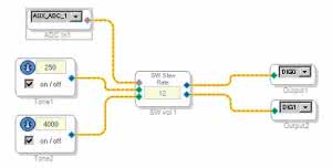 W celu realizacji aplikacji w obszar roboczy przeciągamy wejścia, GPIO, bloki generatora i wyjścia. Łączymy i konfigurujemy je zgodnie ze schematem z rysunku 4.