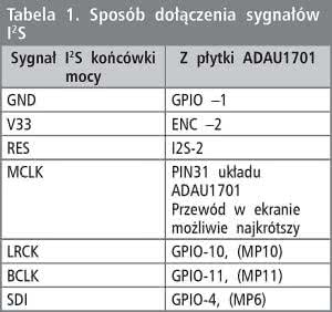 Moduł końcówki mocy I²S jest zmontowany na niewielkiej dwustronnej płytce drukowanej, Rozmieszczenie elementów pokazano na rysunku 2. Montaż jest typowy i nie wymaga opisu. Należy zwrócić uwagę na poprawne przylutowanie padu termicznego. Zmontowany moduł nie wymaga uruchamiania. Dla sprawdzenia poprawności funkcjonowania konieczne jest wykonanie kilku połączeń z płytką bazową ADAU1701 lub bezpośrednio z modułem ADAU1701, zgodnie z informacjami umieszczonymi w tabeli 1. Wszystkie połączenia powinny być możliwie najkrótsze.