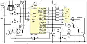 Schemat ideowy metronomu pokazano na rysunku 1. "Sercem" urządzenia jest mikrokontroler US1 typu ATtiny2313. Do wyprowadzeń portu B, za pośrednictwem rezystorów R1...R7, dołączone są katody trzycyfrowego wyświetlacza LED1, który jest sterowany w trybie multipleksowanym: wspólne dla każdej cyfry anody zasilane są poprzez tranzystory T1...T3 z trzech wyprowadzeń portu D. Zastosowanie tranzystorów było konieczne, ponieważ wydajność prądowa poszczególnych wyprowadzeń mikrokontrolera nie przekracza 20 mA. Dioda LED2 służy do sygnalizacji optycznej wybijanego rytmu. Przyciski S1...S3 są dołączone pomiędzy masę a wejście mikrokontrolera. Rezystory R12...R14 utrzymują na nich poziom wysoki podczas oczekiwania na wciśnięcie któregokolwiek z przycisków. Obwód rezystor R15 - kondensator C3 odpowiada za restart mikrokontrolera po włączeniu zasilania. Kondensatory C1 i C2 filtrują zakłócenia, które mogłyby rozprzestrzeniać się po układzie.