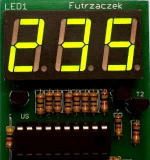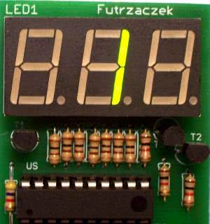 W układzie modelowym zastosowano wyświetlacz świecący w kolorze zielonym.Jest on czytelny nawet przy niskim napięciu zasilania, lecz lepszym rozwiązaniem może być zastosowanie wyświetlacza świecącego na czerwono, z racji mniejszej wartości napięcia przewodzenia zastosowanych w nim diod. W handlu dostępne są również wyświetlacze działające przy mniejszym, niż standardowe, prądzie świecenia każdego segmentu. Zastosowanie takiego przyczyni się do dalszego spadku poboru mocy, lecz wymagać będzie zwiększenia wartości rezystorów R1...R7. Dioda LED2 może być dowolna - warto jednak pamiętać, że zieleń jest kolorem, na który nasze oczy są wyczulone najbardziej. Diody białe lub niebieskie mogą nie funkcjonować przy zasilaniu ich napięciem 3 V.