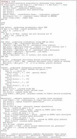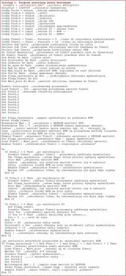Program został napisany w środowisku BASCOM-AVR. Jego kod zamieszczono na listingu 1. Program używa obu timerów mikrokontrolera. Timer0, z preskalerem dzielącym częstotliwość zegara przez 8, steruje wyświetlaczami. Ma on pojemność 8 bitów i jest do niego ładowana wartość 156 (28-100=156), co oznacza, że podprogram obsługi przerwania wykonuje się ok. 800 razy na sekundę, zaś każda cyfra odświeżana jest z częstotliwością trzykrotnie mniejszą, wynoszącą ok. 266 Hz. Jest to wartość wystarczająca dla uzyskania wrażenia braku migotania wyświetlanych cyfr.