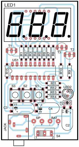 Układ zmontowano na jednostronnej płytce drukowanej o wymiarach 43 mm×78 mm, której schemat montażowy pokazano na rysunku 4. Montaż jest wykonywany typowo: od elementów najniższych po najwyższe. Pod układ US1 należy zastosować podstawkę. Kondensatory elektrolityczne powinny być wlutowane w pozycji leżącej - wówczas wyświetlacz, przyciski, przełącznik i diodę można bezpośrednio przystawić do ścianki. Gniazdo Jack jest tak usytuowane, że można je przykręcić nakrętką do obudowy. W układzie modelowym, jako głośnik SP, zastosowano głośniczek piezoelektryczny (bez generatora), o rezystancji cewki wynoszącej w przybliżeniu 16 Ω. Bardzo dobrze spisuje się przy napięciu zasilania przekraczającym 4 V, lecz poniżej tej wartości staje się za cichy, zwłaszcza do ćwiczeń z perkusją. Innych rozwiązaniem jest użycie zwykłego głośnika elektrodynamicznego o impedancji cewki 8 Ω lub 16 Ω. Zwiększona powierzchnia membrany zapewnia dobrą słyszalność, nawet przy zasilaniu napięciem 3 V.