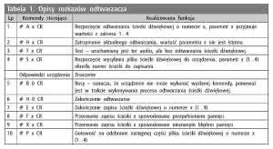 Ogólna postać komend sterujących oraz odpowiedzi urządzenia to: #, rozkaz, parametr, CR. Znak # to umowny znak początku każdej komendy, CR to znak końca linii odpowiadający naciśnięciu ENTER (wartość hex 0x0D). Opisy rozkazów i parametrów umieszczono w tabeli 1. Pomiędzy znakami nie ma odstepu.