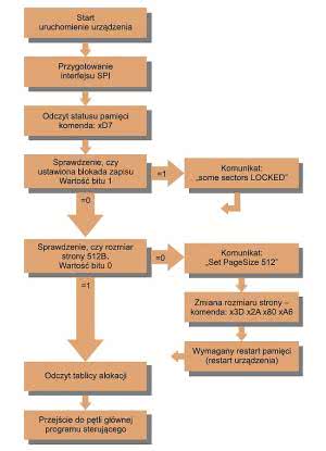 Kolejnym i ostatnim zadaniem (odnoszącym się do pamięci Flash) wykonywanym po uruchomieniu jest odczyt prostej tablicy alokacji umieszczonej umownie na czwartej stronie obszaru pamięci. Jej zawartość zostaje skopiowana do pamięci operacyjnej mikrokontrolera. Cały proces inicjacji pamięci pokazano na rysunku 2.