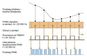 W trakcie odtwarzania ścieżki dźwiękowej jest wybrany tryb odczytu ciągłego z pamięci, a Timer1 pracuje w trybie generatora PWM i pełni rolę źródła przerwań generowanych z częstotliwością 44,1 kHz. Częstotliwość ta jest podwojoną częstotliwością próbkowania dźwięku, ponieważ odczyt kolejnych próbek z pamięci odbywa się tylko co drugie przerwanie, z częstotliwością 22050 Hz. Pomiędzy odczytami z pamięci jest uaktualniana wartość współczynnika wypełnienia dla generatora PWM oraz odliczana liczba stron pamięci pozostała do końca ścieżki dźwiękowej, zatem cały proces odtwarzania jest realizowany w krótkiej procedurze obsługi przerwania i nie przeszkadza w normalnym wykonywaniu pętli głównej programu. Opisywany proces zobrazowano na rysunku 4.