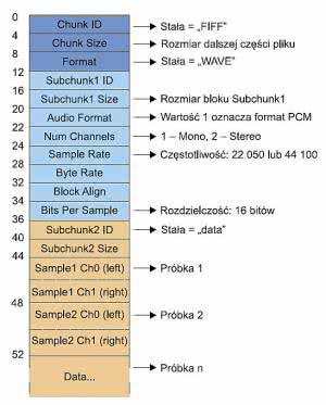 Na rysunku 5 pokazano nagłówek pliku WAV z zaznaczeniem ważniejszych elementów. Właściwe dane dźwiękowe rozpoczynają się od elementu zawierającego ciąg znaków data. Jego adres nie jest stały i należy go obliczyć uwzględniając wartość elementu Subchunk1 Size. Jeśli odpowiedni ciąg znaków nie będzie znajdował się pod obliczonym adresem, to aplikacja nie otworzy pliku. Gdy po wybraniu pliku zostanie naciśnięty przycisk Send, to aplikacja utworzy bufor o pojemności 512 bajtów i zacznie zapisywać do niego przetworzone próbki. Gdy bufor będzie pełny, to rozpocznie się wysyłanie danych do urządzenia poprzez wskazany port szeregowy. W trakcie wysyłania przygotowywana będzie kolejna paczka danych.