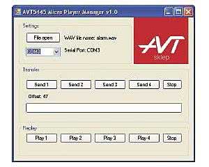Aplikację napisano w Visual Basic 2010 Express Studio, jej wygląd pokazano na rysunku 6. Do uruchomienia aplikacji jest wymagany system operacyjny Windows z zainstalowany pakietem Net Framework w wersji 2.0 lub nowszej. Okienko jest proste - pozwala wysyłać pliki (przyciski "Send") i odtwarzać je na urządzeniu (przyciski "Play"). Każdy proces można w każdej chwili przerwać przyciskami "Stop". W trakcie wysyłania pliku do urządzenia wyświetlany jest adres ("Offset") ostatnio przetworzonej próbki oraz pasek postępu. Po każdej operacji zostanie wyświetlone odpowiednie podsumowanie.