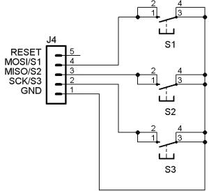 Na złącze J4 wyprowadzonych zostało pięć pinów mikrokontrolera, które są niezbędne, by móc go programować w układzie (ISP - In System Programming). Rezystory: R2 oraz R4...R6 ustalają stan tych wyprowadzeń na poziomie logicznej "1", co zapobiega gromadzeniu się na nich ładunków elektrostatycznych i błędnemu działaniu układu. Do tego samego złącza dołącza się miniaturową, trójprzyciskową klawiaturę, która umożliwia skonfigurowanie parametrów pracy termostatu. Jej schemat pokazano na rysunku 2.