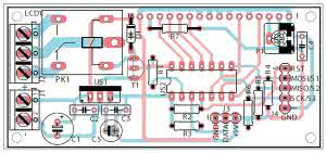 Układ zmontowany został na dwustronnej płytce o wymiarach 83 mm×39 mm, której schemat montażowy pokazano na rysunku 3. Rozstaw otworów mocujących oraz umiejscowienie złącza J6 jest zgodne z typowymi wyświetlaczami 1×16 ze sterownikami zgodnymi z HD44780.
