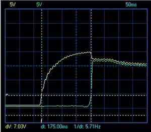 Na rysunku 4 pokazano oscylogram zdjęty w czasie włączania zasilania. Pokazuje on przebieg napięcia zasilania na kondensatorze CE1 (żółty przebieg) oraz napięcie na przekaźnikach (zielony przebieg). Kondensator nie był całkowicie rozładowany (występowało na nim napięcie ok. +5 V). Górna linia (żółta) pokazuje napięcie +7 V, przy którym działa prawidłowo stabilizator modułu wykonawczego. Przekaźniki zasilane są po ok. 175 ms od załączanie zasilania, gdy kondensator CE1 jest naładowany.