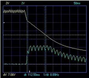 Na rysunku 5 pokazano oscylogram zdjęty podczas wyłączania układu. Pokazuje on napięcie zasilania na kondensatorze CE1 (żółty przebieg) oraz napięcie na wejściu INT0 mikrokontrolera (zielony przebieg). Zagięcie charakterystyki żółtej (przecięcie z lewą linią niebieską) to moment zadziałania przerwania i odłączenia napięcia zasilającego moduł wykonawczy i przekaźniki. Do spadku napięcia do +7 V (prawidłowe zasilanie stabilizatora) upływa ok. 110 ms, co w zupełności wystarcza do zapisu pamięci EEPROM (zapisujemy tylko jeden bajt).