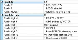 We fusebitach zmieniono jedynie taktowanie mikrokontrolera z 1 MHz na 8 MHz. Ustawienie najważniejszych fusebitów mikrokontrolerów: