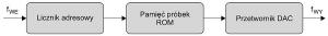 W tak nieskomplikowanym układzie generatora DDS wejściowy sygnał zegarowy o częstotliwości fWE "napędza" w sposób bezpośredni licznik adresowy, którego wyjścia adresują z kolei pamięć próbek sygnału wyjściowego. Wartości kolejnych próbek podawane są wejście przetwornika C/A, który zamienia je na wyjściowy sygnał analogowy. Sygnał ten, po odfiltrowaniu składowych harmonicznych, których obecność wynika z procesu przetwarzania cyfrowo-analogowego, może być wykorzystany jako "normalny" sygnał analogowy. W układzie takim częstotliwość wyjściowego sygnału analogowego fWY obliczyć możemy na podstawie zależności: