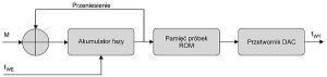 Łatwo zauważyć, że przedstawiona zależność znacznie ogranicza funkcjonalność tego typu konstrukcji, gdyż trudno jest uzyskać dokładną, żądaną częstotliwość przebiegu wyjściowego bez możliwości precyzyjnej regulacji częstotliwości źródła sygnału taktującego, co niejako niweczy sens budowania tego typu układu. Aby wyeliminować niedoskonałość takiego układu wprowadzono rozwiązanie, w którym licznik adresowy zastąpiono specjalnym modułem nazywanym akumulatorem fazy, dzięki czemu powstał generator, którego poglądowy schemat blokowy pokazano na rysunku 2.