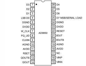 Na rysunku 3 przedstawiono wygląd obudowy układu AD9850 wraz z rozmieszczeniem wyprowadzeń, zaś w tabeli 1 umieszczono pełnione przez nie funkcje.